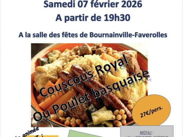 Prochainement Le comité des fêtes de Bournainville-Faverolles organise une soirée couscous royal, animé par Jean-Mi. Au menu, au choix couscous royal ou poulet basquaise, ... BOURNAINVILLE-FAVEROLLES Soirée couscous royal samedi 07/02